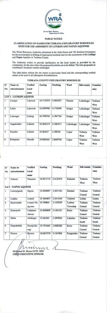 Water Resources Authority has issued a clarification on the local names of proposed exploratory borehole sites in Turkana County under the assessment of the Lotikipi and Napuu Aquifers.